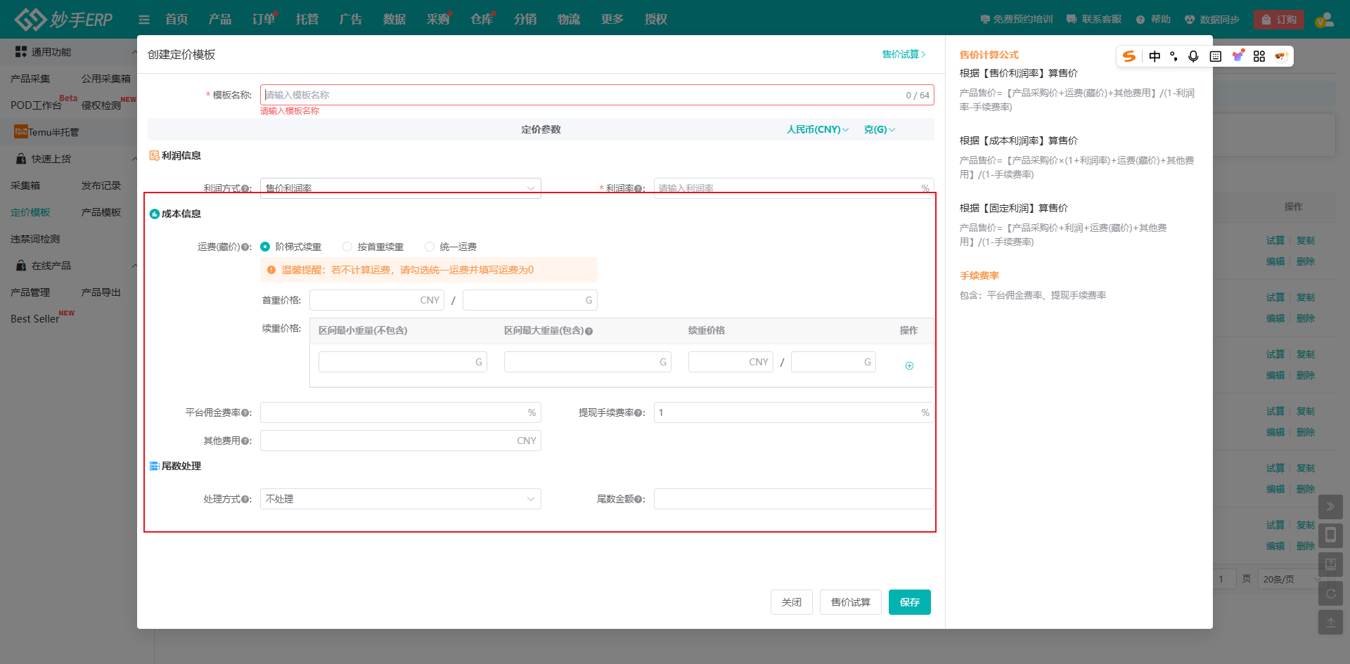 要避免这些错误,卖家可以借助专业工具。妙手ERP的定价模板功能能够帮助卖家精准计算包含关税等新增成本的保本价格,快速响应平台政策和竞品变化。