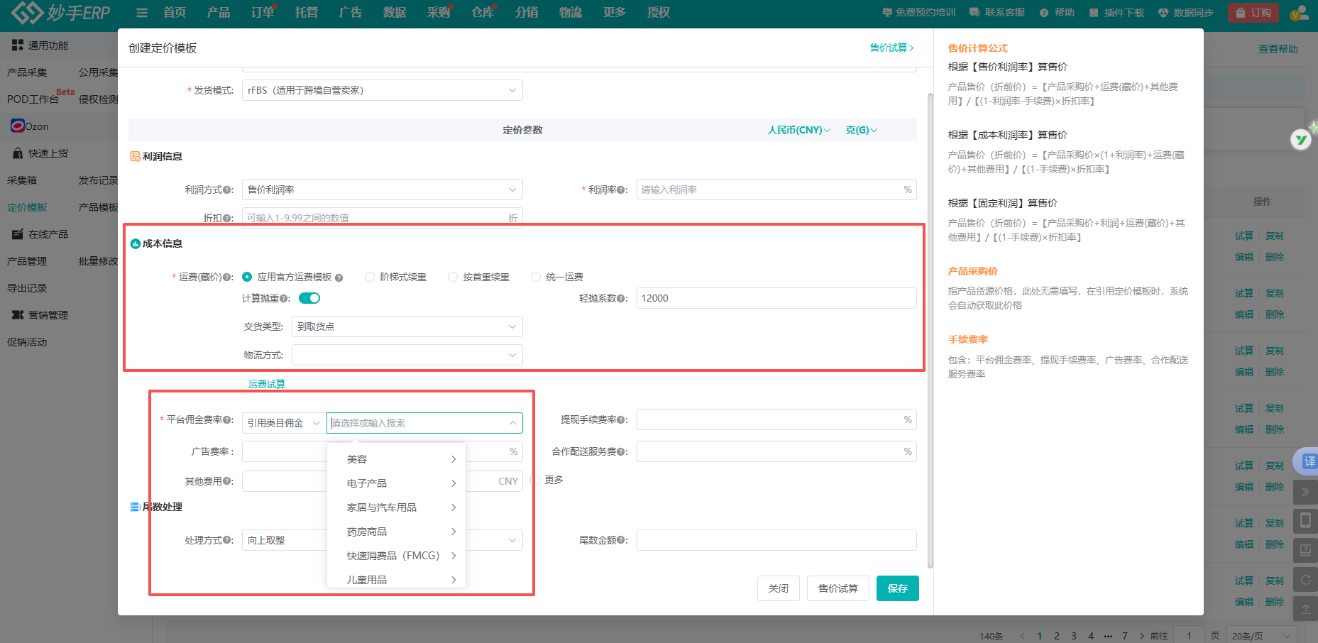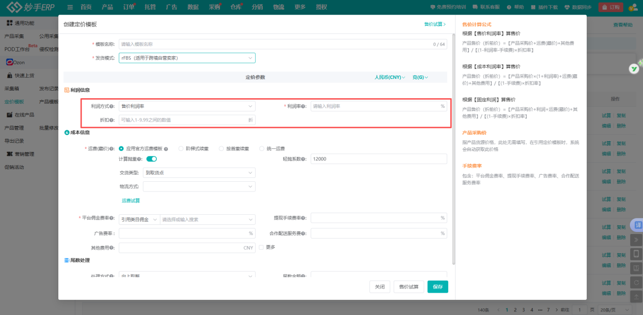 妙手ERP针对Ozon各类发货模式,量身定制了专属定价模板。卖家只需选择相应的发货模式,系统将自动匹配对应的定价模板,帮助不同模式卖家制定更精准的定价方案。