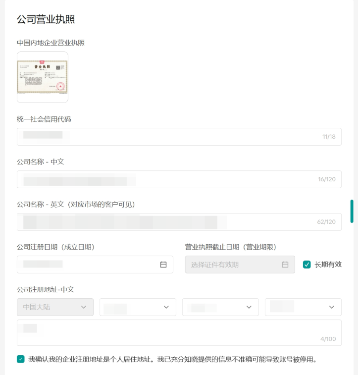 ② 公司营业执照号码:系统会自动识别图片中的号码,但是请注意识别可能存在误差(如:S和5, O和0, 2和Z,1和I 等),请务必自行校验一次。如填错无法修改;