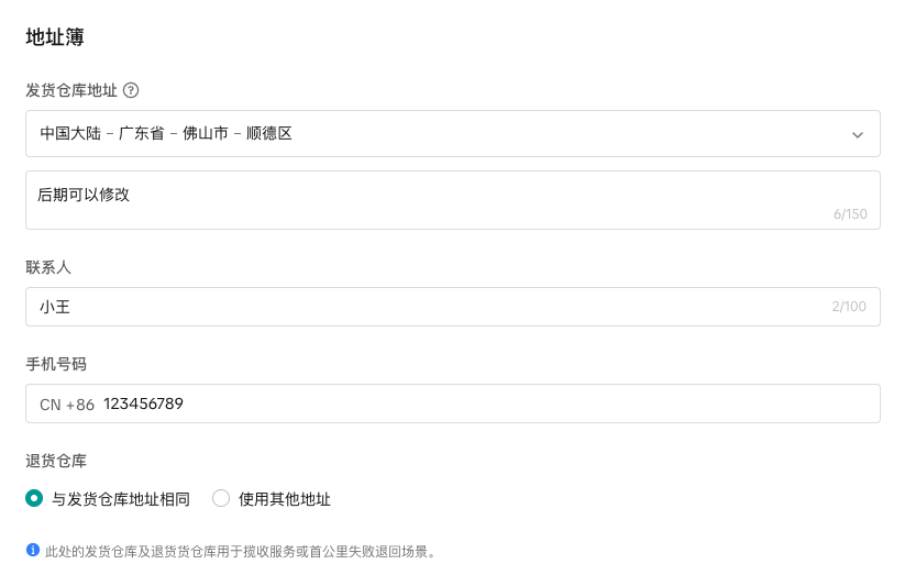 ·在入驻流程里,不论中国大陆主体,或是中国香港主体的商家,可选择填写1-2个仓库。(后续可以进入“商家后台—商家资料”编辑新增)