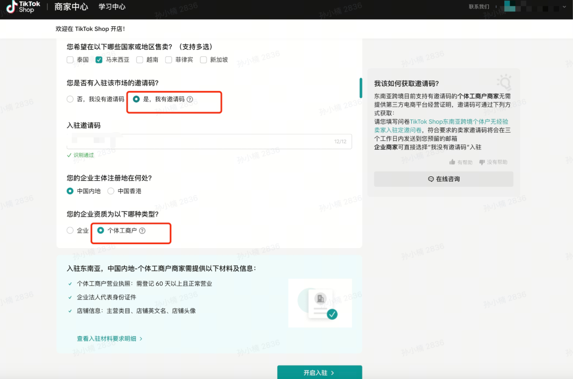 步骤3:收取邀请码后,即可入驻页面申请个体户无经验入驻